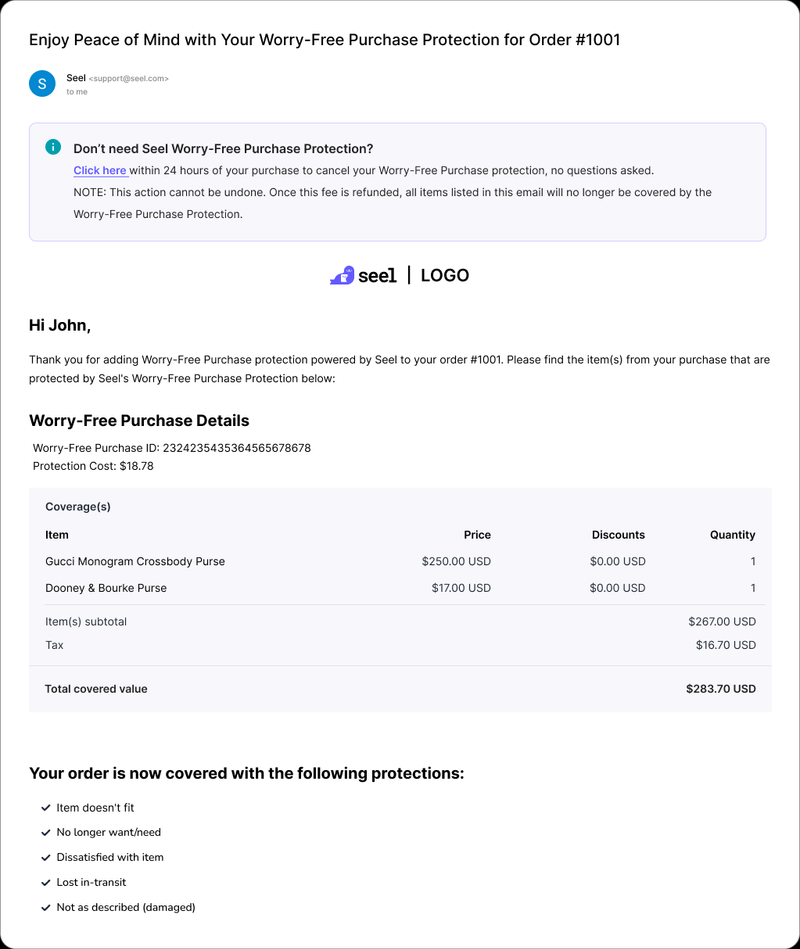 Seel sends you a confirmation that explains the specific coverage provided for your order. An example of the confirmation email can be found below, which will be sent from support@seel.com.